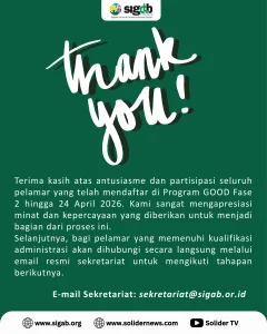 Terima kasih atas antusiasme dan partisipasi seluruh pelamar Program GOOD fase 2 yang telah mendaftar hingga 24 April 2026. Kami sangat mengapresiasi minat dan kepercayaan yang diberikan untuk menjadi bagian dari proses ini.
