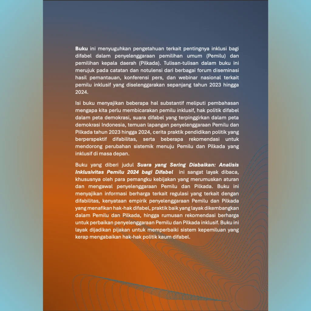 Buku ini menyuguhkan pengetahuan terkait pentingnya inklusi bagi difabel dalam penyelenggaraan pemilihan umum (Pemilu) dan pemilihan kepala daerah (Pilkada). Tulisan-tulisan dalam buku ini merujuk pada catatan dan notulensi dari berbagai forum diseminasi hasil pemantauan, konferensi pers, dan webinar nasional terkait pemilu inklusif yang diselenggarakan sepanjang tahun 2023 hingga 2024.