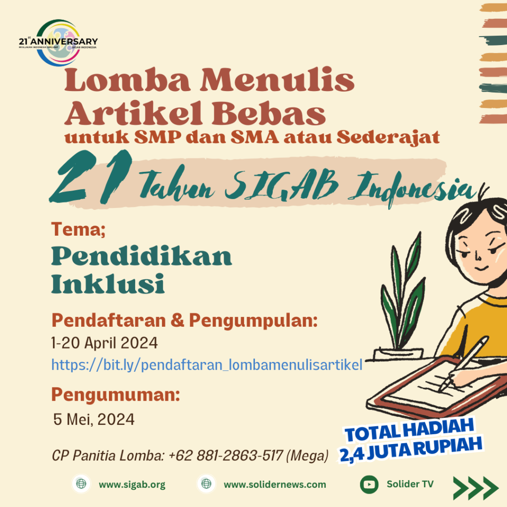 Menyongsong hari ulang tahunnya yang ke – 21, lembaga Sasana Inklusi dan Gerakan Advokasi Difabel (SIGAB) Indonesia selenggarakan lomba menulis artikel bebas. Lomba ini dibuka untuk siswa SMP-SMA/Sederajat dengan tema Pendidikan Inklusi. Beberapa persyarakatan untuk mengikuti perlombaan ini diantaranya: Peserta lomba adalah siswa SMP-SMA/Sederajat Artikel menggambarkan topik yang diangkat (Tema: Pendidikan Inklusi) Tulisan-500-750 kata […]