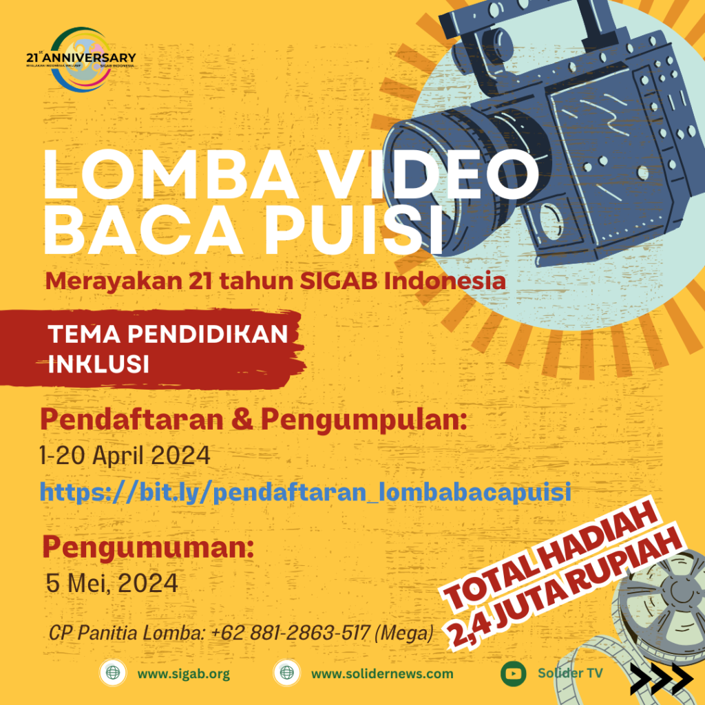 Dalam rangka memeriahkan hari ulang tahun lembaga Sasana Inklusi dan Gerakan Advokasi Difabel (SIGAB) Indonesia, panitia menyelenggarakan lomba video membaca puisi dengan tema Pendidikan Inklusi. Lomba yang bertujuan untuk meningkatkan awareness tentang isu inklusi difabel di kalangan masyarakat umum ini dibuka hingga tanggal 20 April 2024. Saat dihubungi redaksi solidernews.com, panitia pelaksana lomba mengungkapkan bahwa panitia menyediakan […]
